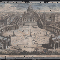 Anche nelle prove degli ultimi anni, come le vedute della Basilica Vaticana e di San Giovanni in Laterano, del 1775, in cui l’acquaforte si fa più pesante e stratificata al fine di sottolineare la vastità e la schiacciante distesa dei monumenti, gli espedienti utilizzati da Piranesi trovano perfetta corrispondenza nell’uso della tenue colorazione a gouache di manifattura napoletana.