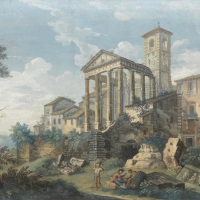 Un esempio è la Veduta del Tempio di Ercole nella Città di Cora (fig. 6) in cui il dialogo tra l’antico e il moderno e la lezione canalettiana sulla natura, che nel suo continuo progredire tende a riappropriarsi delle rovine, sono accompagnati da una leggera coloritura che smorza il tratteggio e addolcisce i segni di quell’eterno conflitto tra il tempo delle cose degli uomini e il tempo della natura, sotteso alla poetica piranesiana. La medesima scelta lieve dei toni si ritrova in una gouache che il vedutista romano Paolo Anesi realizzò negli stessi anni sul modello della stampa del maestro, a cui, forse, si ispirò l’artista che dipinse a guazzo le opere napoletane (fig. 7) .