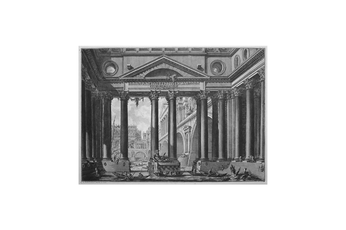 Queste parole, tratte dall’ Allocuzione che Piranesi avrebbe voluto indirizzare ai membri della Accademia di San Luca a Roma nel 1757 circa, racchiudono il significato che l’Architetto Veneziano dava al concetto di libertà: questa è non solo civica, ma anche libertà d’espressione e d’azione, e nello scegliere una giustificazione per tale definizione, rivolgendosi all’antico, Piranesi dà esempio di una correlazione costante con il presente. L’esempio antico informa la sua libertà creativa generando una perenne tensione vibrante nelle sue opere. In queste brevi parole Piranesi inoltre contrappone il concetto della libertà a quello dell’oppressione. Già nel decennio precedente Piranesi aveva pubblicato la prima edizione delle sue imponenti Invenzioni Capric di Carceri (ca. 1750) in cui sceglie come tema il luogo di pena che comunque disegna con vertiginosa libertà descrittiva; a distanza di circa dieci anni lavorava alla seconda e finale stesura di questo magistrale componimento: le Carceri d’Invenzione. Il tema – ormai incentrato sulla qualità opprimente e penale delle carceri – anziché scenografica – non è casuale: negli anni di mezzo del secolo si andavano riconsiderando le strutture giudiziarie ereditate dai secoli precedenti, contraddistinte dall’ epoca delle inquisizioni, e si discutevano le procedure penali: tra i maggiori pensatori e riformatori dell’illuminismo contribuivano al dibattito, primi tra tutti Cesare Beccaria col suo Dei delitti e delle pene del 1764 posteriore di pochi anni alle Carceri di Piranesi, e Jean-Jacques Rousseau col suo Discorso sull’origine e i fondamenti della diseguaglianza tra gli uomini del 1754, e l’importantissimo Contratto sociale del 1762; da giovane professionista quest’ultimo, è degno di nota, passò un anno tra il 1743 e il 1744 lavorando come segretario dell’Ambasciatore Francese a Venezia – proprio nello stesso periodo in cui Piranesi fece il suo primo rientro in patria da Roma.