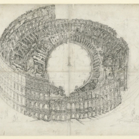 Apice della lucidissima e razionalissima fantasia piranesiana è la Veduta dell’Anfiteatro Flavio detto il Colosseo, del 1776 ca. Dal punto di vista prospettico, si tratta sicuramente di una delle vedute più audaci mai disegnate da Piranesi: una spettacolare vista a volo d’uccello dell’interno dell’anfiteatro, da un punto di vista virtuale posto a oltre 100 m di altezza dal terreno, a sud del monumento. Alla scelta di questa ardita veduta sono da riferire anche gli splendidi disegni conservati alla Kunstbibliotek di Berlino che raffigurano il monumento sempre “a volo d’uccello” ma da diversi punti di vista, ossia da nord e da ovest.